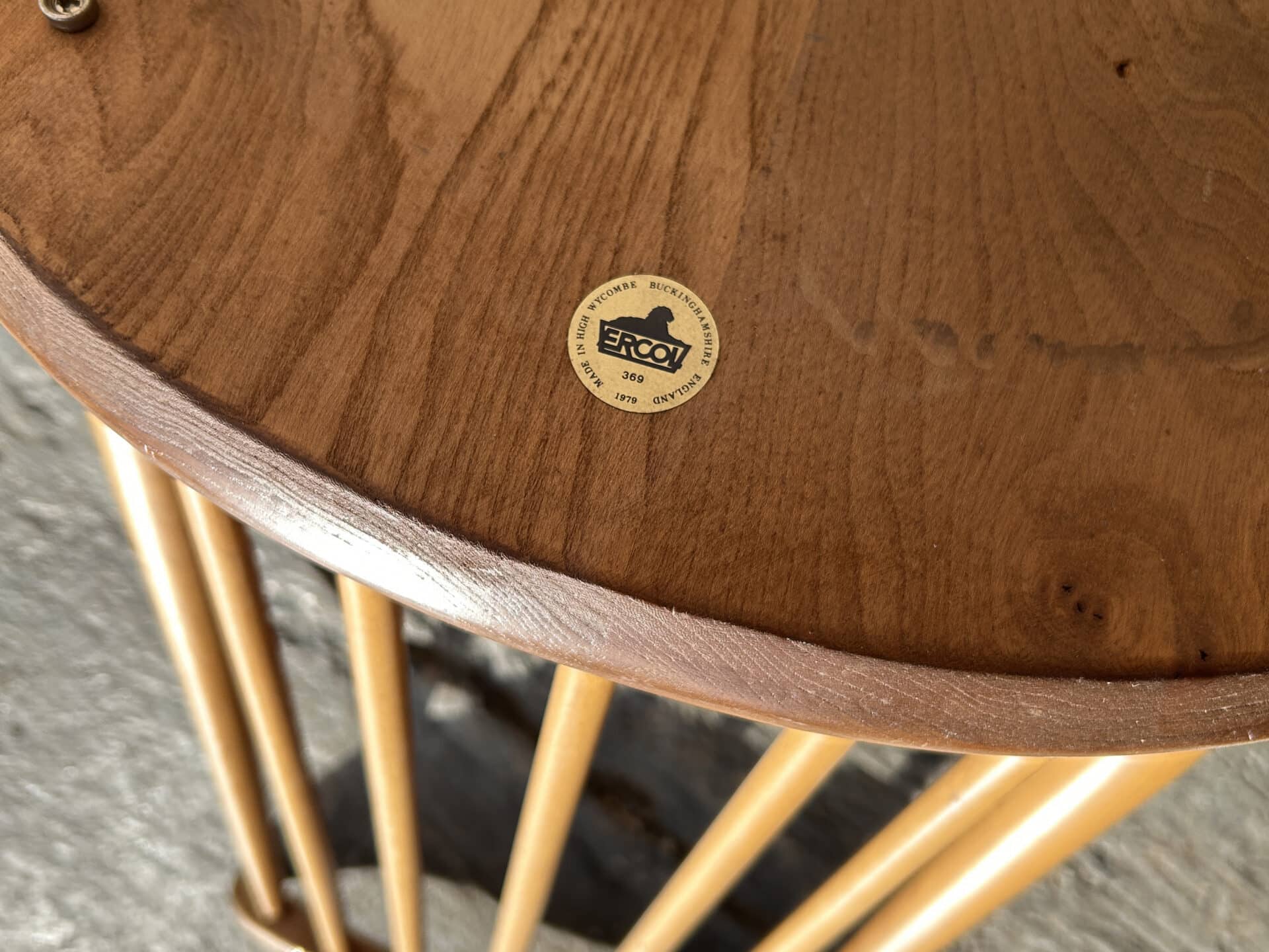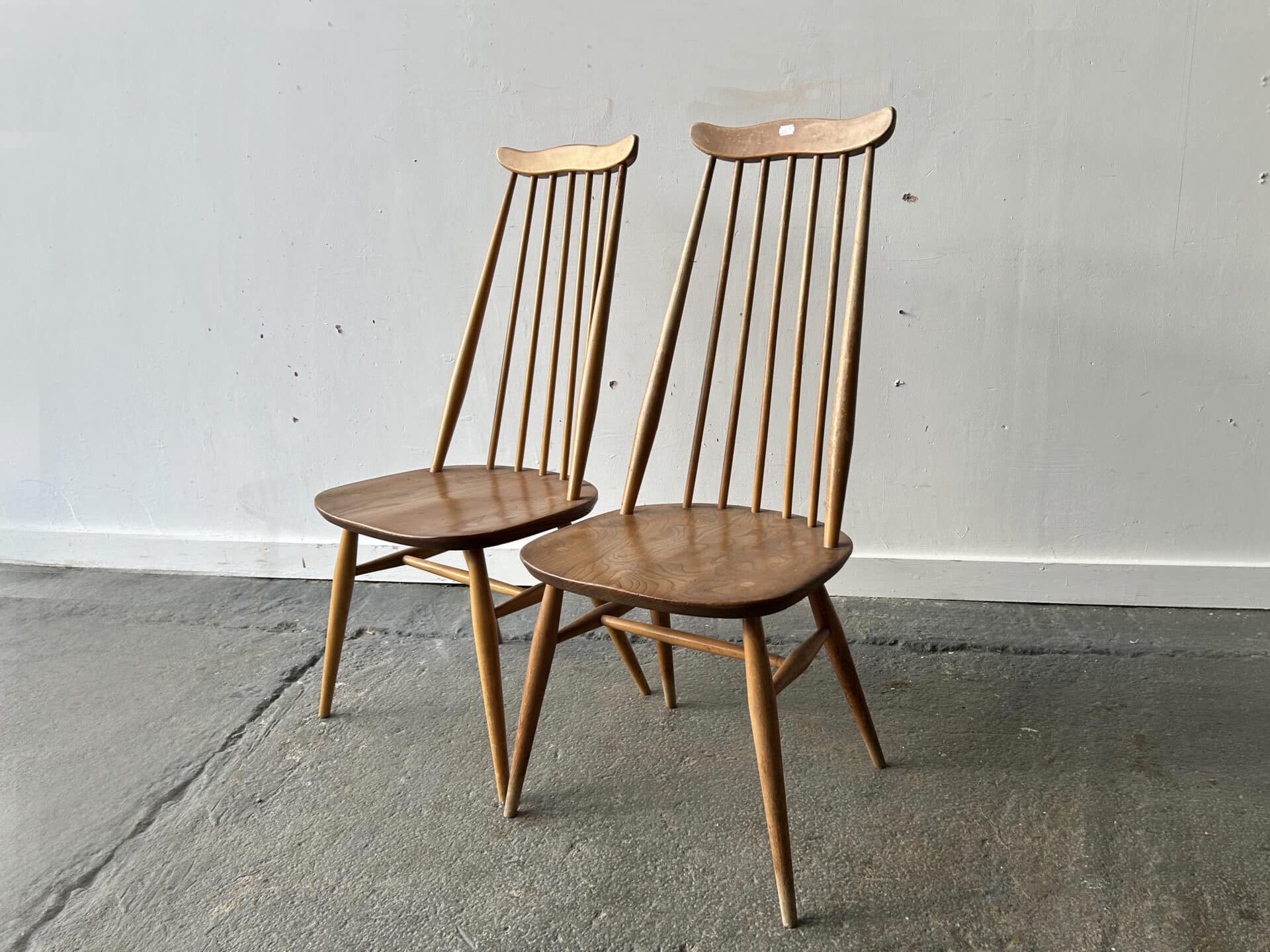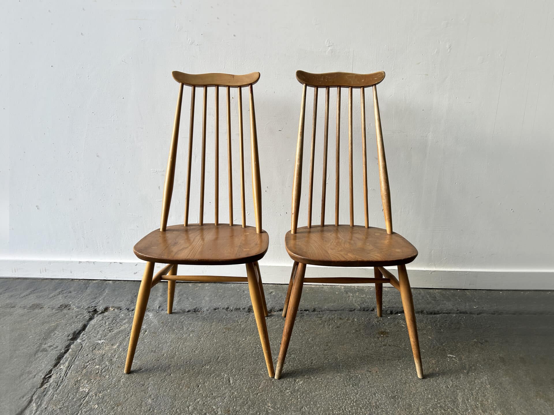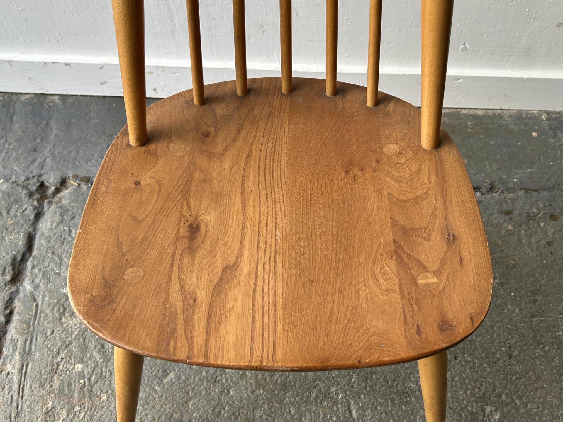 The chairs feature the classic Ercol hoop and spindle back The seats are solid elm with visible grain, set on turned beech legs joined by traditional stretchers.