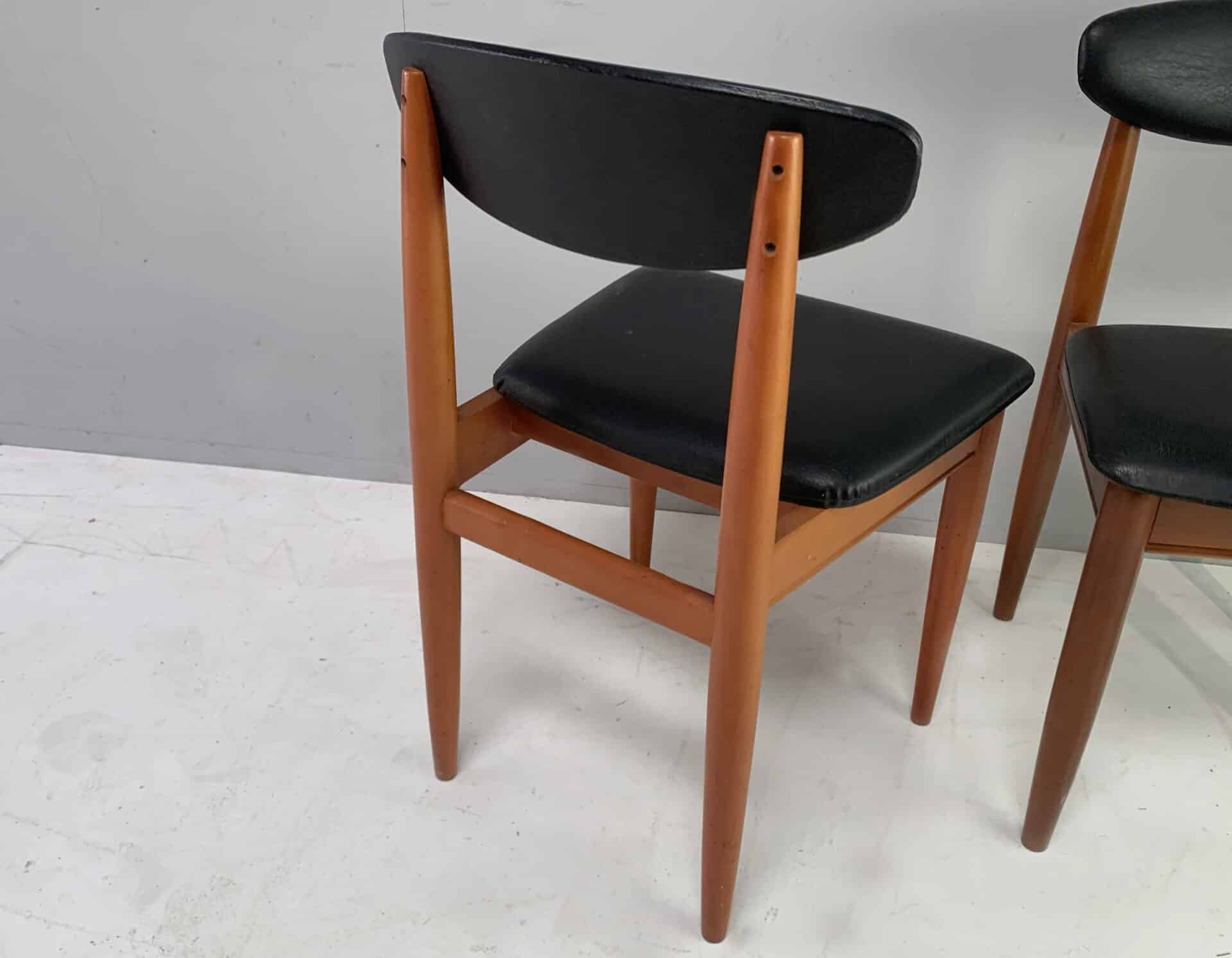 These dining chairs are typical of the Schreiber style. Light coloured solid teak with tapered legs and contoured back rest. The original black leatherette upholstery is well padded in and fantastic condition
