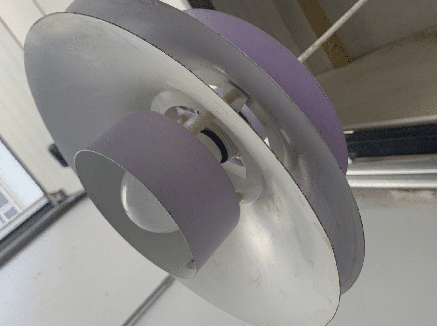 A petite Mid-Century Modern ceiling lamp. similar in style to the designs of famous Danish designer Louis Poulsen. With lilac coloured spray painted metal.