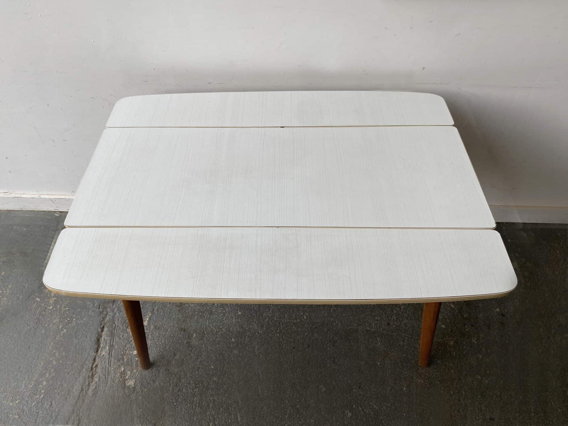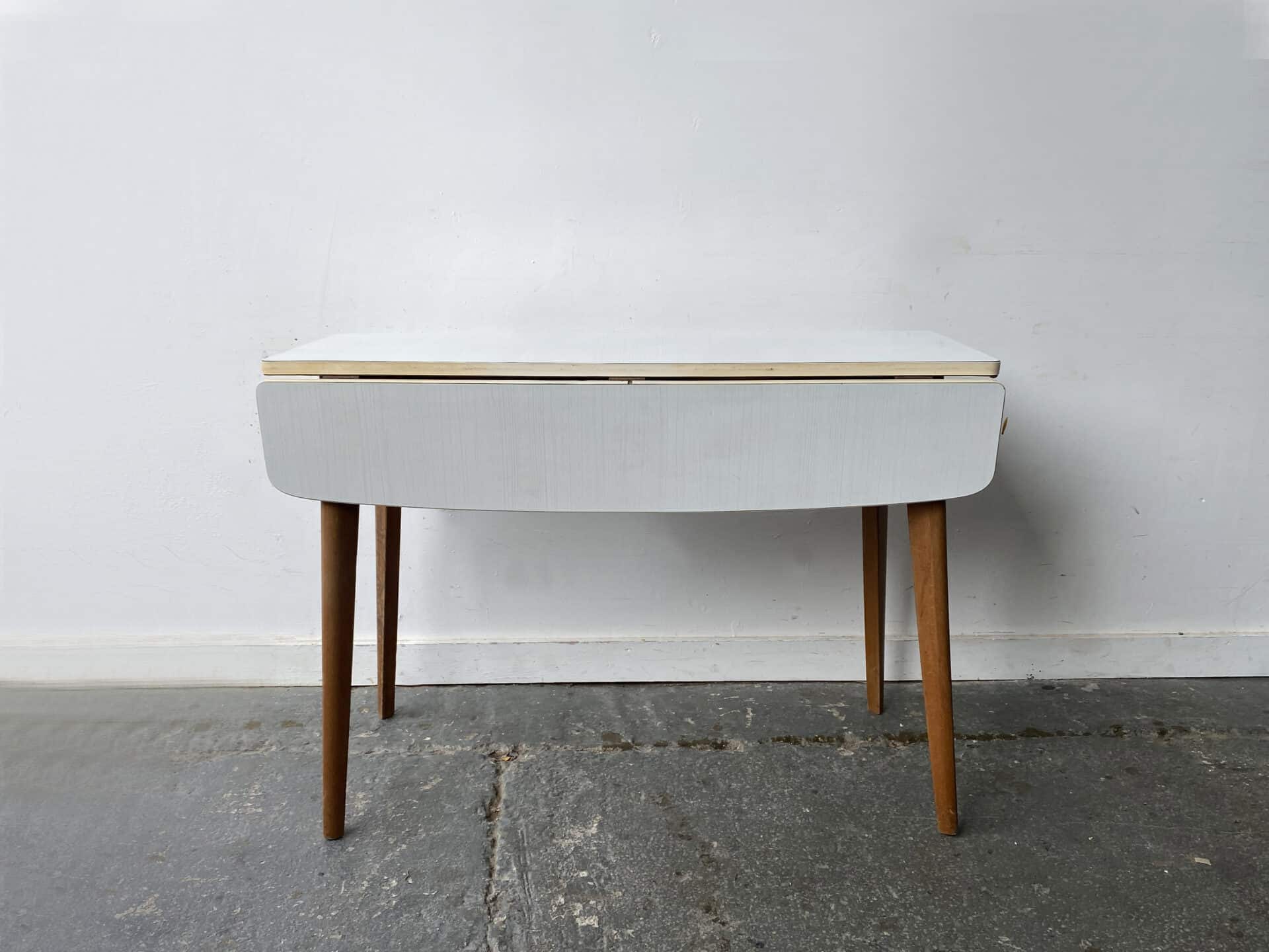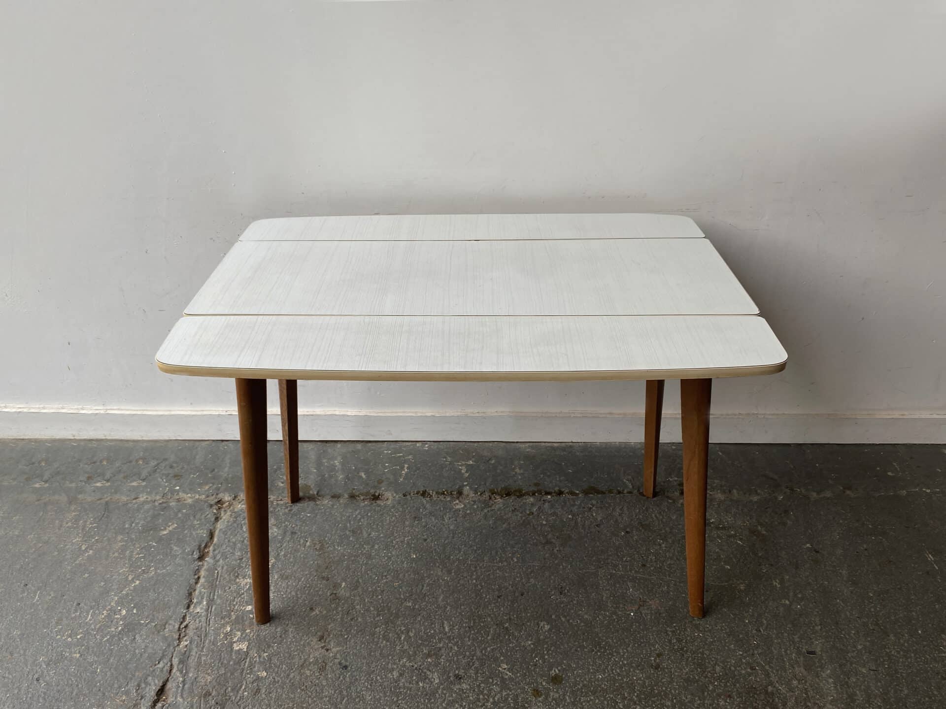 This is a Mid-Century drop-leaf dining / kitchen table with a clean, minimalist design. It features a rectangular top with rounded edges and a light grey laminate surface with subtle pattern. The table stands on tapered solid beech legs that angle slightly outward.
