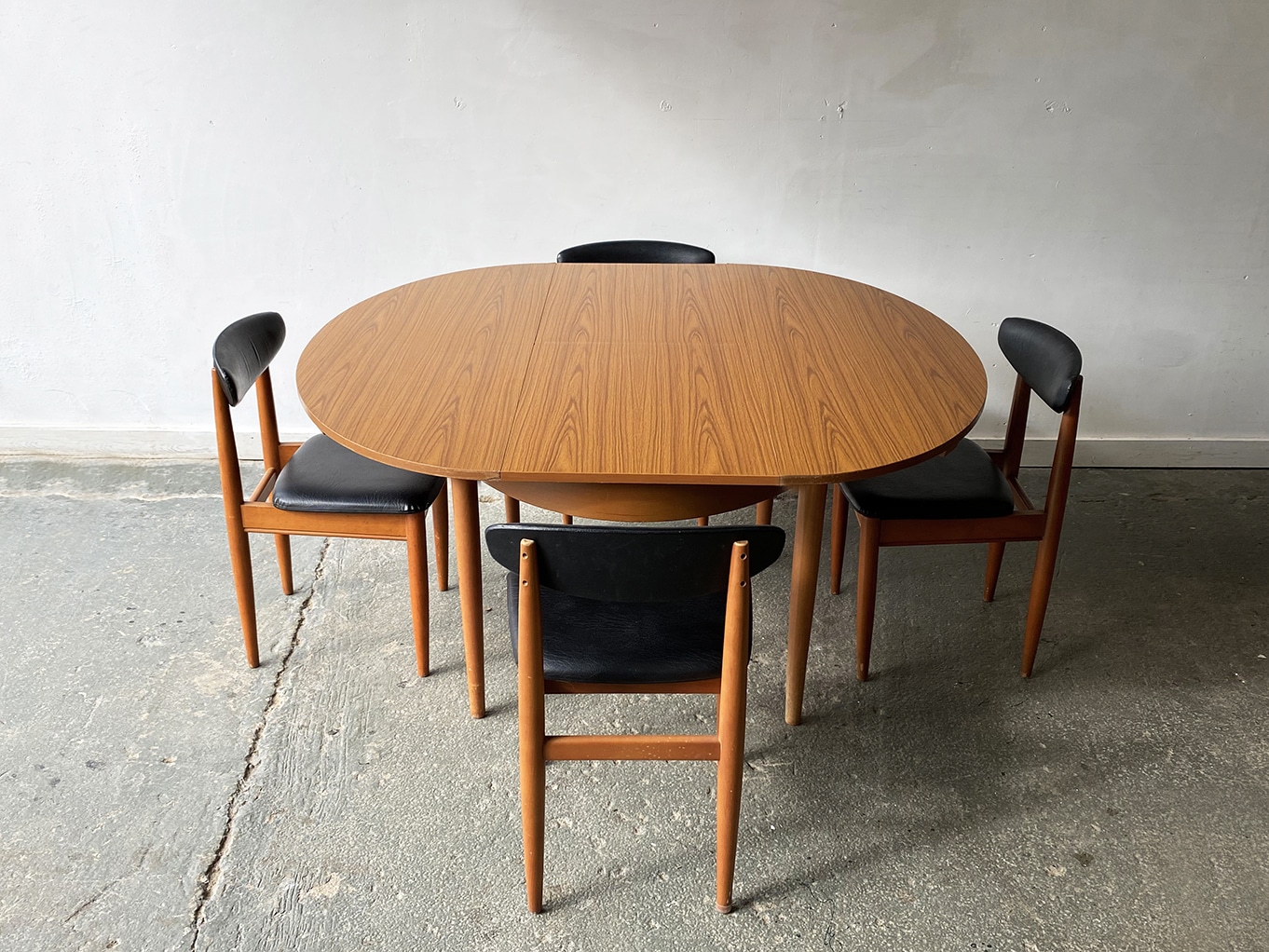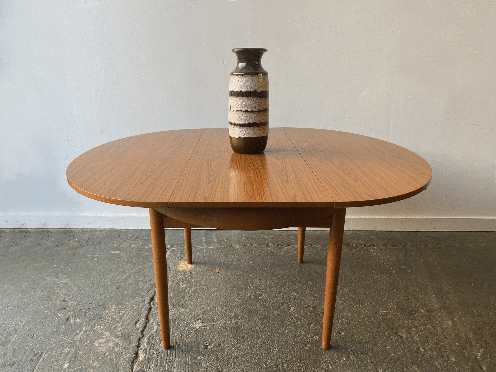 This Schreiber extending dining table is typical of the Schreiber style. Their signature wood grain Formica laminate table top and gently tapering solid beech legs.