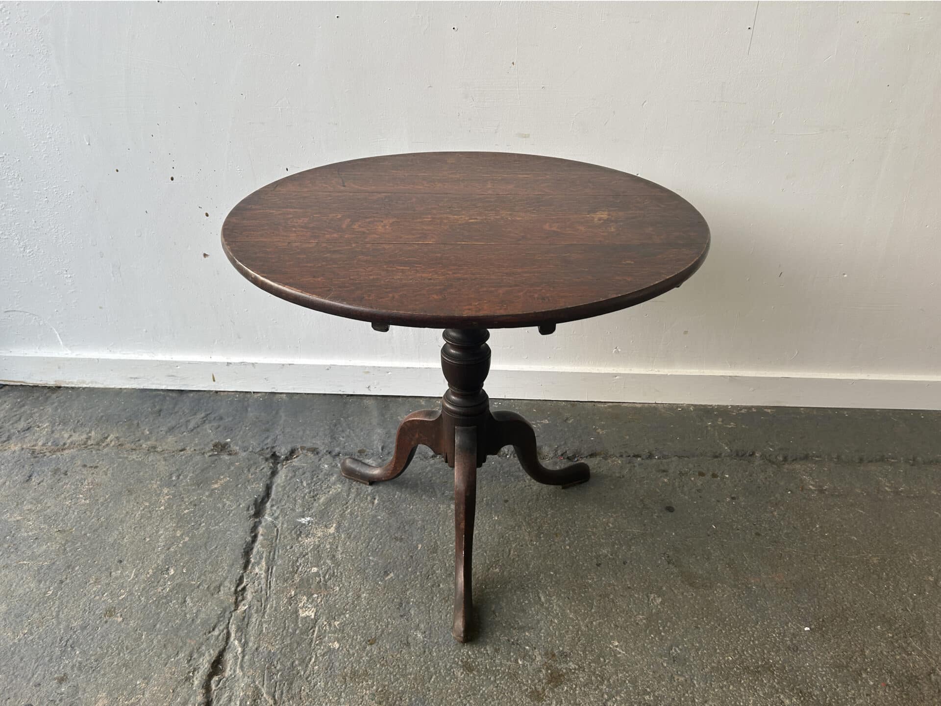 A compact circular wooden tilt-top occasional table with a single central turned pedestal and three cabriole-style legs forming a tripod base. The top tilts down to a vertical position when not in use, a traditional feature designed to save space.