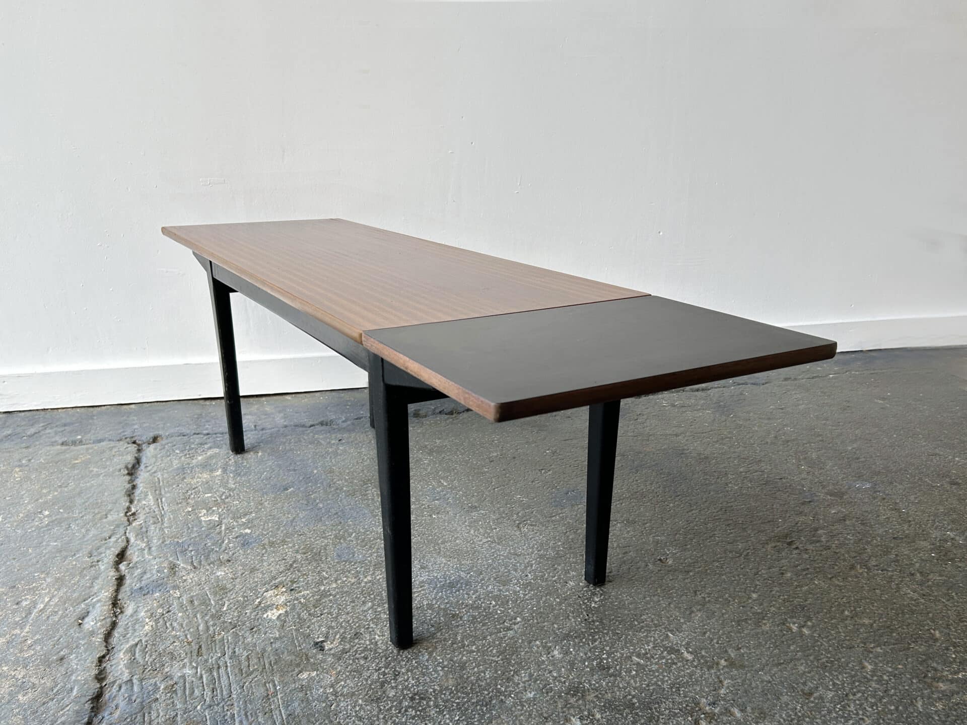 A unique Mid-Century coffee table with an extendable top, made by English manufacturer Nathan. The tabletop slides along the frame, allowing an extra black melamine surface to be lifted for use or lowered when not needed. Please ask if you would like to see a video of this in action.
