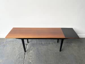 A compact Mid-Century circular dining table with slim tapered solid Beech legs. The table top surface is finished in a wood grain effect Formica. The table features a clean, minimalist design with extendable leaves making it well suited for smaller dining spaces or kitchen use. In excellent condition.