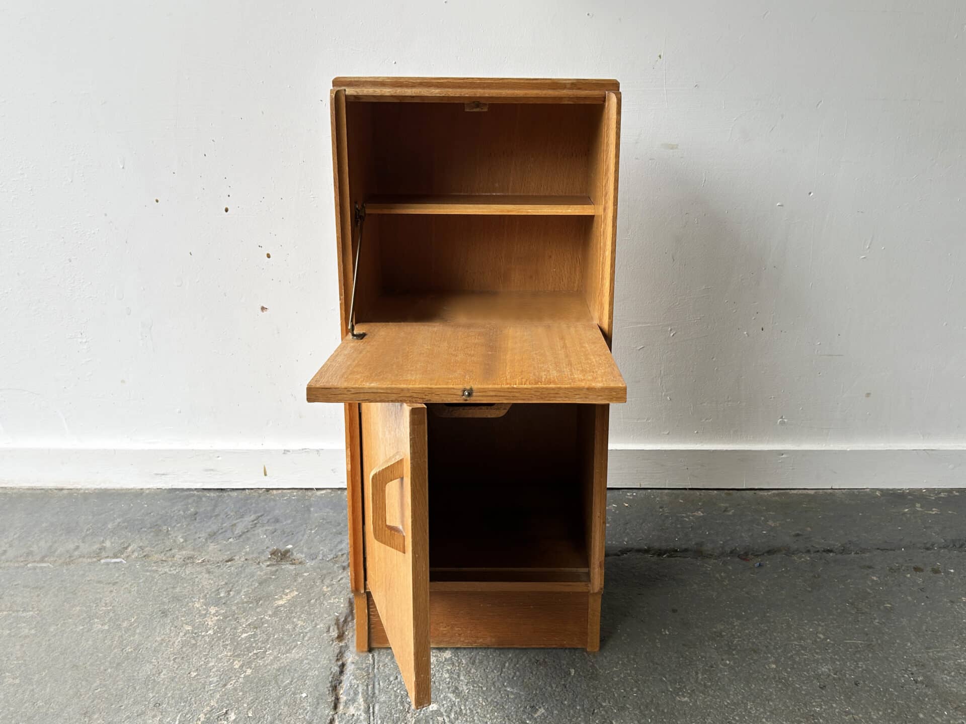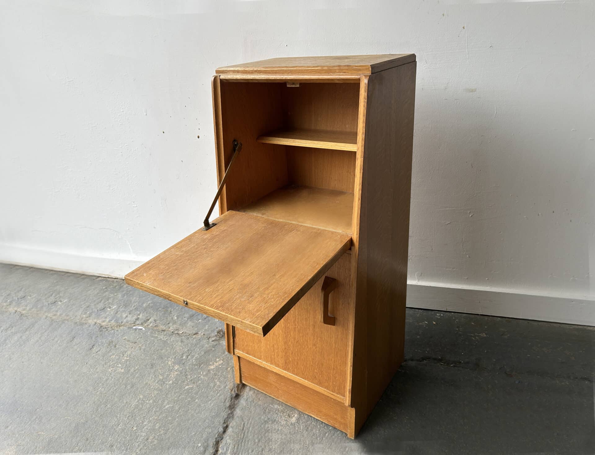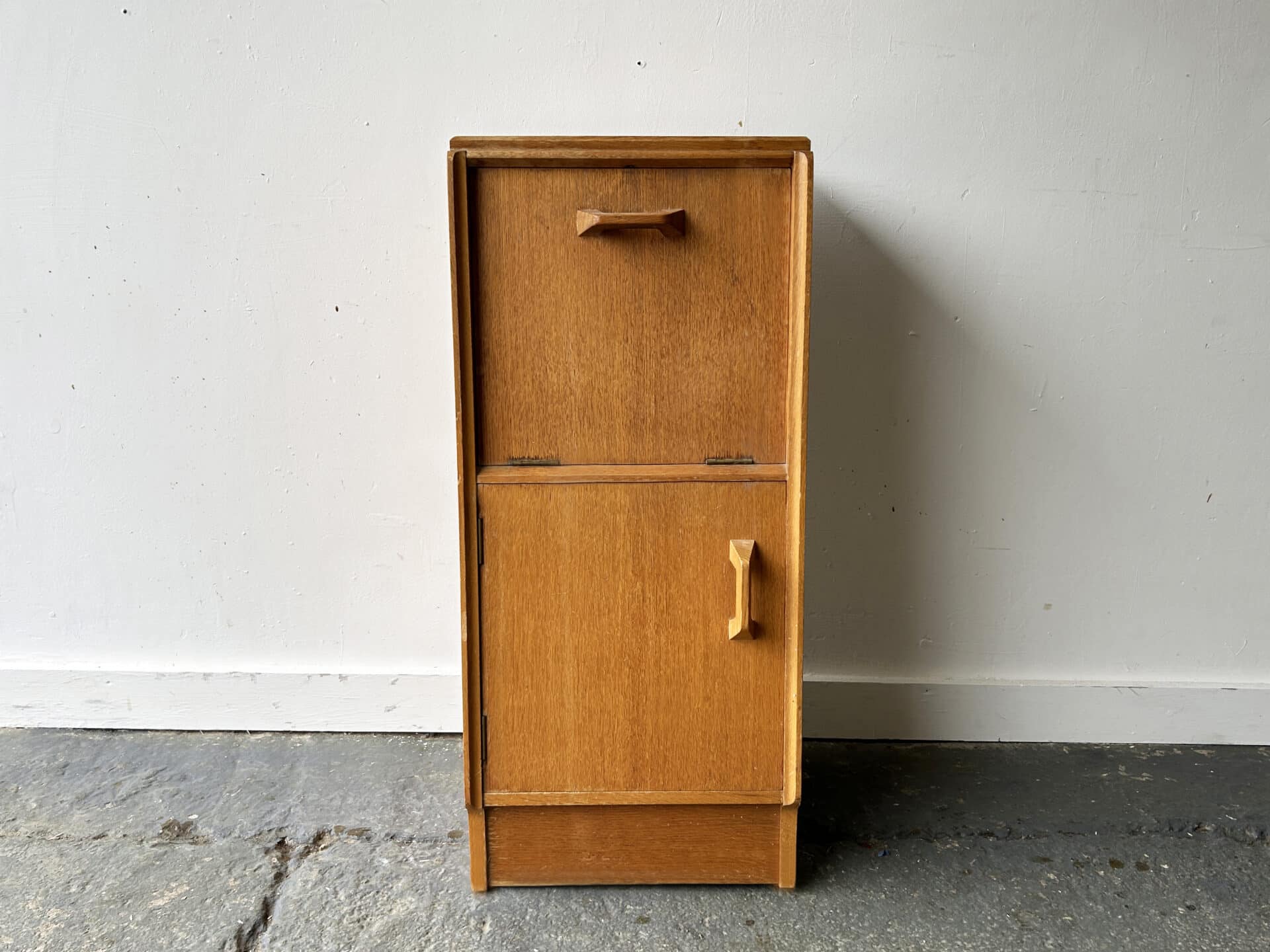 A compact Mid-Century bedside unit in light oak, featuring a top drop-down cupboard door and a lower hinged cupboard. Part of the ‘Brandon’ range produced by G Plan / E Gomme in the 1950/60s.