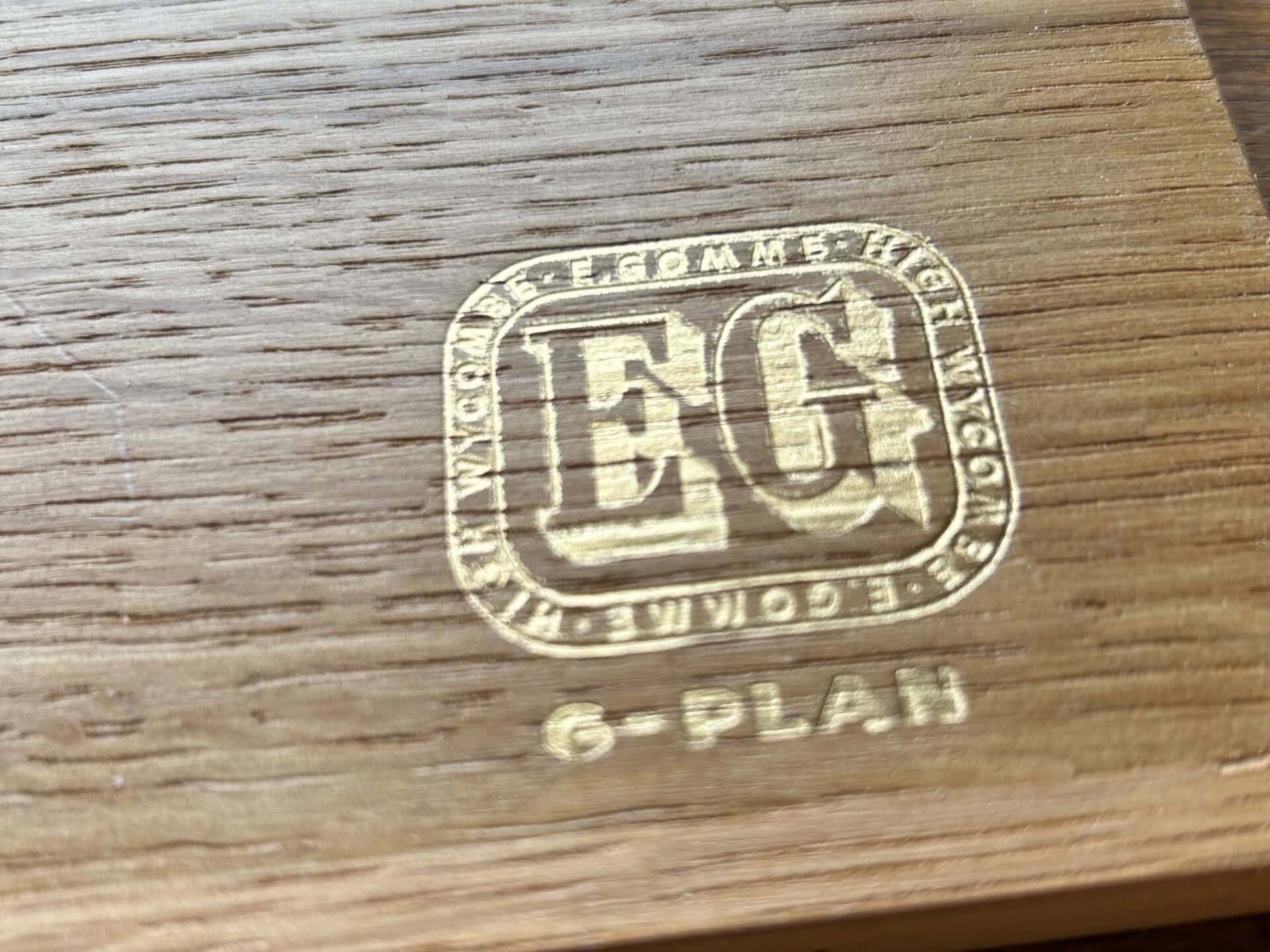 It has the sculpted solid wood handles, which are typical of G Plan / E Gomme furniture from the period. The cabinet sits on a recessed plinth base.